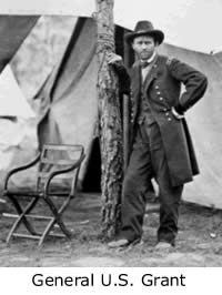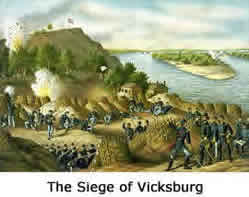 Grant also tried advancing through the bayous on the far side of the river across from Vicksburg, but also to no avail. In the spring of 1863 he even sent Sherman's men to dig a ditch that would reroute the Mississippi River so that he could get by the Vicksburg gun batteries without serious casualties. The river would not cooperate and refused to flow through “Grant’s ditch.” (Ironically, in the summer following the war during a great thunderstorm, the Mississippi actually began to flow as Grant had hoped it would. Grant's ditch is still visible from the city of Vicksburg to this day.) Grant then called his senior commanders together to discuss another plan. He decided to have Foote carry his army across the Mississippi and then march down the western bank of the river. Meanwhile, he would have Flag Officer Foote float his transports and gunboats down the Mississippi past the Vicksburg batteries under cover of darkness. Once south of the city, Grant would use the transports to carry his army back across the river, move inland and attack Vicksburg from the land side. Generals Sherman and McPherson were skeptical of the idea but had faith in Grant’s vision. Much of Grant's success lay in the fact that he trusted his own judgment, even when some of his trusted subordinates disagreed with him. Foote floated all but one of his boats by the Vicksburg batteries, and Grant got his army back onto the Vicksburg side of the river well south of the city. Cut off from his base in Memphis, Grant now took a daring step. Instead of trying to keep connected with a supply base on the river, he had his soldiers round up all the supplies, wagons and animals they could find and took his supplies with him. They would live off the land. When he cut loose from the Mississippi, he was completely out of touch with the rest of the Union. Lincoln feared that Grant had made a terrible mistake, and when he heard nothing from the general for 18 days, he anticipated only the worst. Grant’s campaign took him in the direction of Jackson, the capital of Mississippi. [See Map] Waiting in Jackson with about 25,000 men at his disposal in Mississippi was Confederate General Joseph Johnston, who was suffering from wounds and was not feeling particularly aggressive. He and Pemberton communicated with each other to try to determine a plan to defend against Grant, but Grant was moving rapidly. Grant sent a cavalry commander, Col. Benjamin Grierson, on a raid from Holly Springs to the north all the way to Baton Rouge in the South, during which Grierson's cavalry troopers uprooted railroad tracks, cut telegraph lines, destroyed supplies and generally led Confederate cavalry on a merry chase. Grierson's action, along with the fact that Grant had a spy in the Confederate Army who kept him informed, helped Grant defeat Johnston's attempts to communicate effectively with Pemberton, and also kept him reasonably well informed of how the two Confederate generals planned to defend Vicksburg. When General Johnston became aware that two corps of Grant's army were approaching Jackson, he ordered the city evacuated, leaving only a minimal defense to slow Grant's advance. The Union Army had no difficulty taking the city within hours of attacking. Grant himself moved into Jackson as his troops burned part of the city and cut off railroad connections with Vicksburg. From there Grant turned his attention towards Vicksburg to the West, leaving a small blocking force to guard against Johnston. Pemberton decided that his best course of action was to come out from Vicksburg and face Grant. He had attempted to attack Grant's supply lines, but discovered that there was nothing there, since Grant had taken all of his supplies with him. Pemberton soon realized that Grant had positioned his entire army between Vicksburg and the city of Jackson. Pemberton's men advanced to a place called Champion’s Hill, and there the two armies fought fiercely. In the end Grant's stronger army handily repelled Pemberton's Confederates. Pemberton made another stand along the Big Black River, but again Grant's forces, knowing that they were in deep in enemy territory and would have to fight their way out one way or another, were in good spirits. They drove the Confederates back once more, and Pemberton's men retreated into the powerful fortifications of Vicksburg. Grant attempted a frontal assault on the city, but the defenses were too strong, and his unsuccessful attempt cost him heavy casualties. His troopers wanted to try it again, and although he had doubts about its possibility of success, he decided to let them try once more. Again they were brutally repulsed. At that juncture, Grant was supposed to have said, “I guess we'll have to dig our way in.”