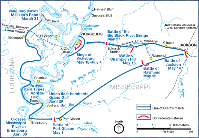 Just as Grant was about to try to blow up the Vicksburg defenses by having his miner engineers tunnel under the fortifications, Pemberton decided that he and the city had had enough. He called for a truce and he and Grant came to terms. Grant allowed Pemberton's army, what was left of it, to be paroled, and equally important, he immediately had supplies brought into the city to feed the famished population. Pemberton surrendered on July 4 Lincoln, who along with Jefferson Davis had grown up in the Mississippi Valley, was elated by the capture of Vicksburg, for he understood exactly what control of the Mississippi meant to the Union, and what the loss of the Mississippi would cost the Confederacy. The southern armies could no longer depend upon support from the West or from supplies smuggled into Mexico and across the border into Texas. The Confederacy was now confined to the area east of the Mississippi, which meant that the Union could strengthen the blockade around the Southern coast from the Virginia capes to New Orleans. The noose was beginning to tighten. Upon hearing the news of Grant's victory, Lincoln said, “Once again the fathers of Waters flows unvexed to the sea.” For military historians, Vicksburg was the great turning point of the war. Back in 1861 the aging General Winfield Scott, who was later rudely nudged out of office by the ambitious young General McClellan, had outlined a strategy to bring the Confederacy to its knees. The so-called “Anaconda plan,” which what is widely derided in the press, was designed to have Union forces surround the Confederacy, isolate, divide and then conquer it. Scott's idea eventually won the war. Vicksburg was a major component of Scott's plan. In the spring of 1864 General Grant was promoted to the rank of lieutenant general, the first United States officer since George Washington to hold that exalted rank. President Lincoln placed Grant in command of all Union troops, in the last phase of the war was about to begin. Grant's Vicksburg Campaign |