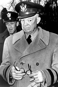 Taking the already present suspicion and fear of the Soviets to new levels, McCarthy went on a frantic chase after Communist conspirators, who he claimed existed in virtually every corner of American life. With little or no evidence, he carried out what can only be called a witch hunt, ruining lives and reputations in the process and eventually bringing himself into disgrace. McCarthy attacked all branches of government, including the State Department and the U.S. Army, the latter of which proved more than a match for McCarthy’s recklessness. In a series of televised hearings, McCarthy and aide Roy Cohn (many called him McCarthy’s hatchet-man) tangled with a tough Army lawyer named Joseph Welch. Welch put Cohn on the spot over some doctored photographs. When McCarthy tried to protect his protégé by slandering a lawyer in Welch’s law firm, Welch turned on McCarthy with a withering indictment. He accused the Senator in front of television cameras of being shameless and dishonorable, as spectators applauded. The first Senator to attack McCarthyism on the floor of the Senate was Republican Margaret Chase Smith of Maine. She called for an end a smear tactics in her “Declaration of Conscience” speech, although she did not mention McCarthy by name. McCarthy was eventually censured by the Senate. An alcoholic, McCarthy died in 1957, but much of the damage done by the Senator and his aides such as Roy Cohn could not be repaired. One such casualty was J. Robert Oppenheimer, father of the atomic bomb, whose top-secret security clearance was suspended in 1953 because of his alleged leftist sympathies during the 1930s. Dwight D. Eisenhower: The General as President Dwight David Eisenhower was born in Texas in 1890, one of six brothers who grew up in Abilene, Kansas. He entered West Point in 1911 and served in the Army during the 1920s and 30s under such illustrious officers as George Patton and Douglas MacArthur. Recognized early for his powerful intelligence and devotion to duty, he held important positions in the years preceding World War II and helped develop doctrine for armored warfare. When World War II broke out, he was brought to Washington to work for General George C. Marshall, the Army Chief of Staff, serving as Chief of the War Plans Division. In 1942 General Eisenhower went to Europe to take command of American forces for the invasion of North Africa, Operation Torch, in 1942. He was subsequently named Supreme Commander Allied Forces Europe and planned and oversaw Operation Overlord, the Allied invasion of Normandy on D-Day, June 6, 1944. As Supreme Commander, he dealt with many challenging personalities, including Winston Churchill, French General Charles de Gaulle, British Field Marshal Bernard Montgomery, senior Soviet Russian officials and his military and civilian superiors in Washington. A measure of Eisenhower’s character is revealed in a message he prepared in advance of the landings in Normandy on D-Day: